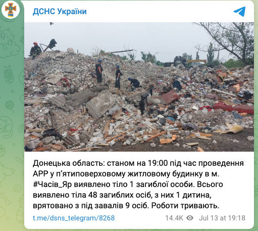 В Часов Яре спасатели достали из-под завалов разрушенного обстрелом жилого дома тело еще одного погибшего. Таким образом общее количество погибших достигло 48 человек.