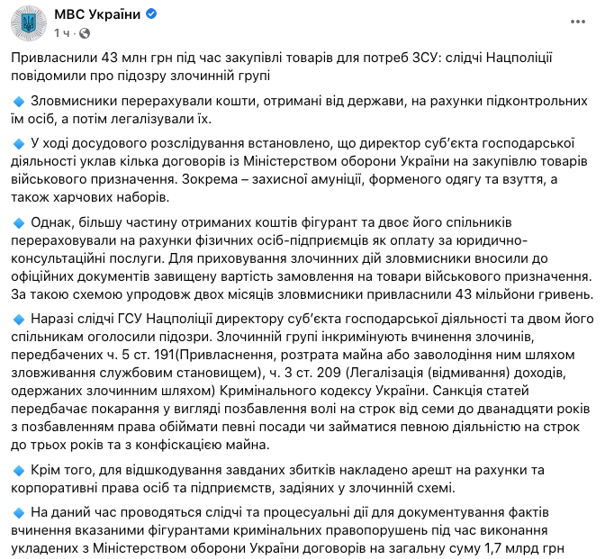 Мошенники украли 43 млн грн, полученных от Минобороны для закупки амуниции и еды для ВСУ