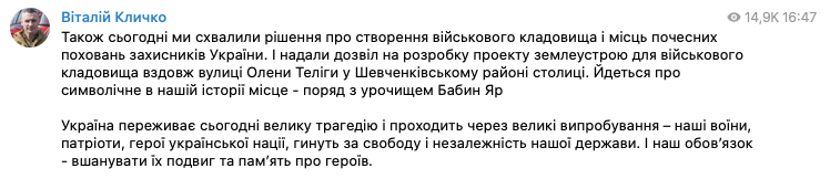 Кличко рассказал, что в Киеве появится отдельное кладбище для погибших защитников Украины. Фото: facebook/Vitaliy.Klychko