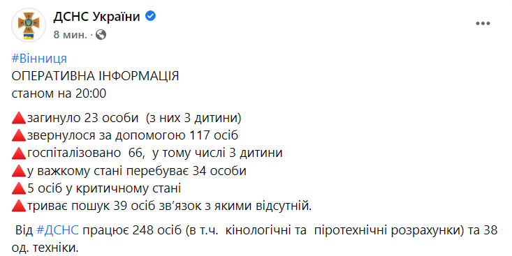 Число погибших после ракетного удара по Виннице выросло до 23-х человек, среди них трое детей