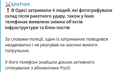 В Одессе правоохранители задержали четырех людей, которые фотографировали места сегодняшних прилетов ракет.