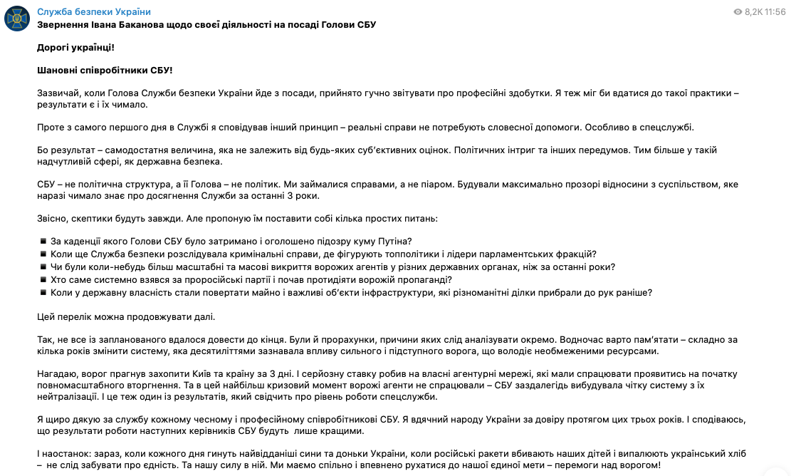 Иван Баканов, которого Верховная Рада только что сняла с должности главы СБУ, опубликовал "обращение насчет своей деятельности на должности главы СБУ".