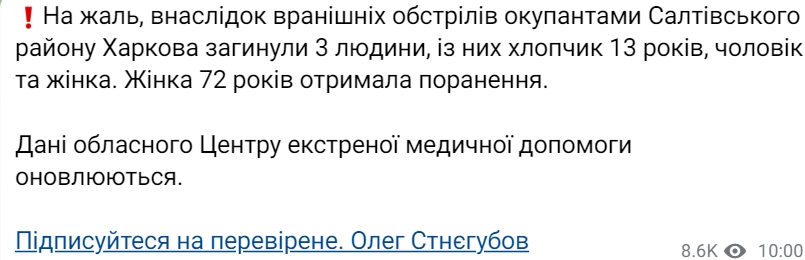 В Харькове в результате утреннего обстрела Салтовки погибли три человека. Среди них - 13-летний подросток