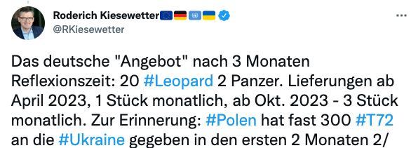 Всего будет поставлено 20 танков. Начиная с апреля 2023-го Украина будет получать по одному танку в месяц, а с октября 2023 - по три штуки в месяц.