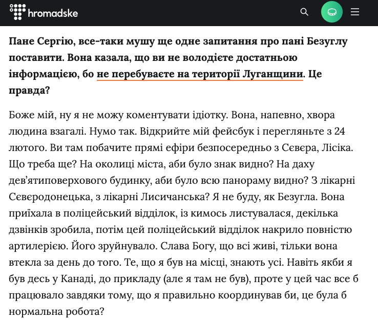 "Боже мой, ну я не могу комментировать идиотку. Она, видимо, больной человек вообще. Давайте так. Откройте мой фейсбук и посмотрите с 24 февраля. Вы там увидите прямые эфиры прямо из Севера, Лисика. Что еще нужно?" – сказал он.