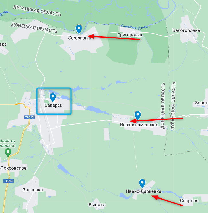 Также, судя по сообщениям российских телеграм-каналов, непосредственно вблизи Северска противник штурмует занятые украинской армией высоты в районе села Серебрянка. А также укрепления ВСУ между Верхнекаменским и Северском. Борьба за высоты вокруг города имеет важное значение, так как сам Северск находится в низине и, в случае потери ВСУ контроля над высотами, оборонять его будет непросто.