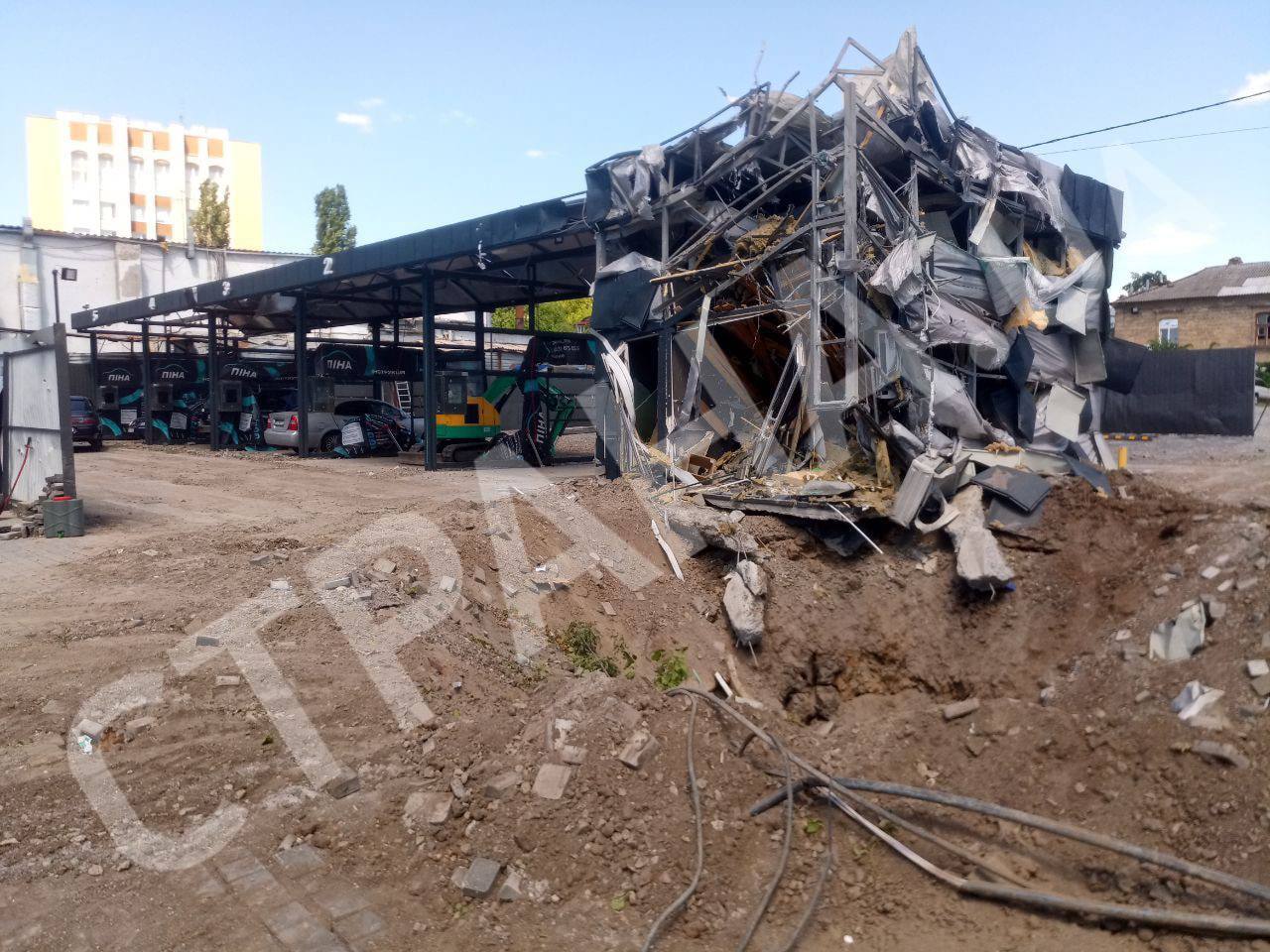 А на этом фото видно, что ракета попала в станцию автомойки. Чудом не взорвалась находящаяся рядом станция заправки машин газом.
