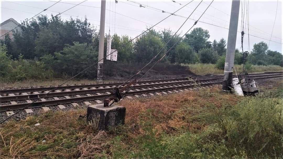 На опубликованных фото видно, что в результате ракетной атаки часть колей погнуло, а местами оторвало. Также повреждены железобетонные столбы и провода.