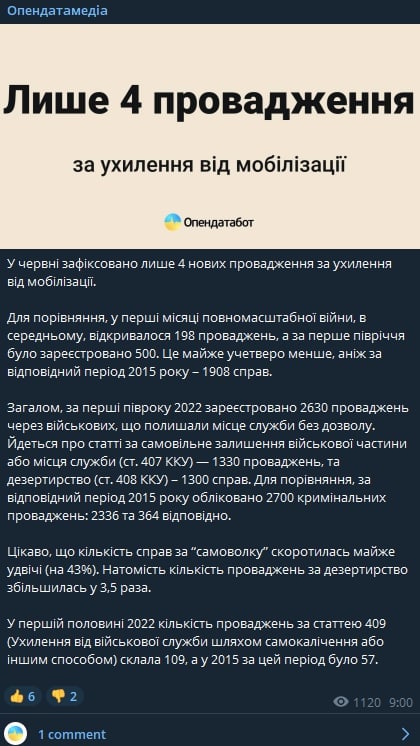 09:22 В июне в Украине зафиксировали лишь 4 производства за уклонение от мобилизации, тогда как в первые месяцы войны, в среднем, открывалось по 198 производств, свидетельствуют данные "Опендатамедиа".