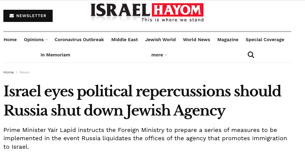 А премьер Яир Лапид заявлял, что закрытие представительства "Сохнут" повредит отношениям его страны с Россией.