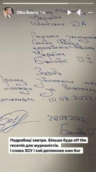 "Подробности завтра. Больше будет Off the records для журналистов. И слава ВСУ и пусть поможет нам Бог", - подписала она фото заявления по собственному желанию в сторис.