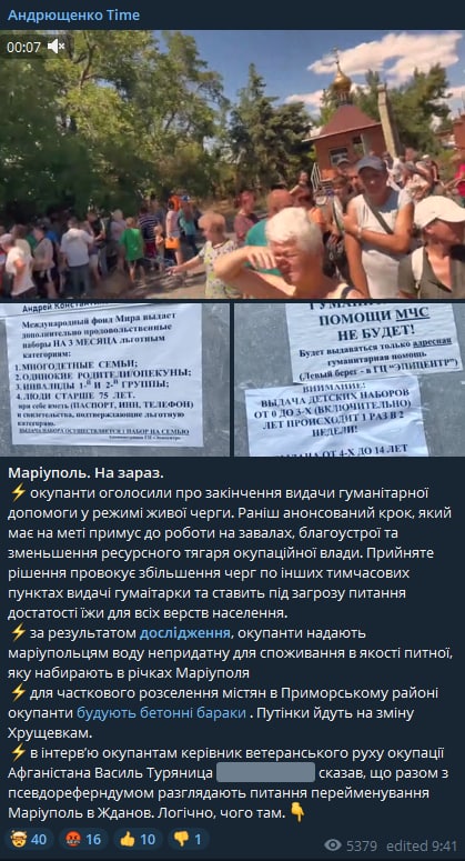"В интервью оккупантам руководитель ветеранского движения оккупации Афганистана Василий Туряница сказал, что вместе с псевдореферендумом рассматривают вопрос переименования Мариуполя в Жданов", - написал он в Telegram.