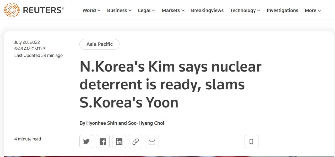 Ким Чен Ын заявил о полной готовности КНДР к военному конфликту с США, а также пригрозил войной новому президенту Южной Кореи Юн Сок Ёлю.