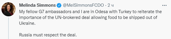 "Мои коллеги-послы G7 и я находимся в Одессе вместе с Турцией, чтобы еще раз подчеркнуть важность сделки при посредничестве ООН, позволяющей вывозить продовольствие из Украины. Россия должна уважать сделку", - написала Симмонс.