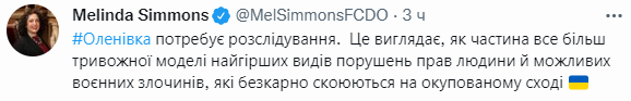 Посол Великобритании в Украине Мелинда Симмонс заявила, что массовое убийство украинских военнопленных в Еленовке нуждается в расследовании.