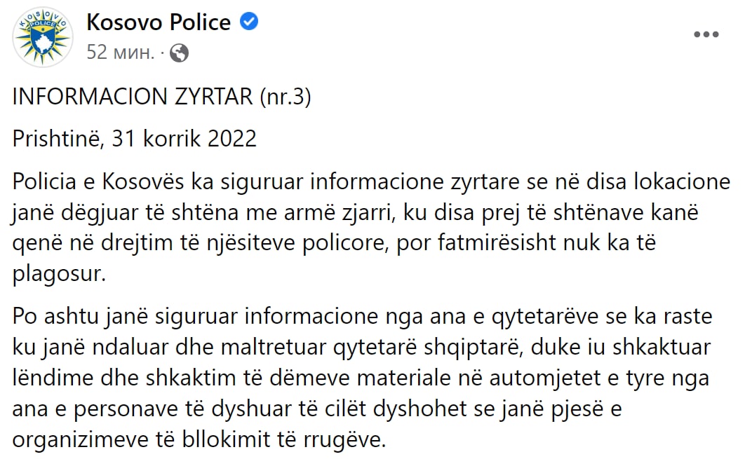Тем временем полиция Косово у себя в Facebook сообщила о выстрелах со стороны протестующих сербов.