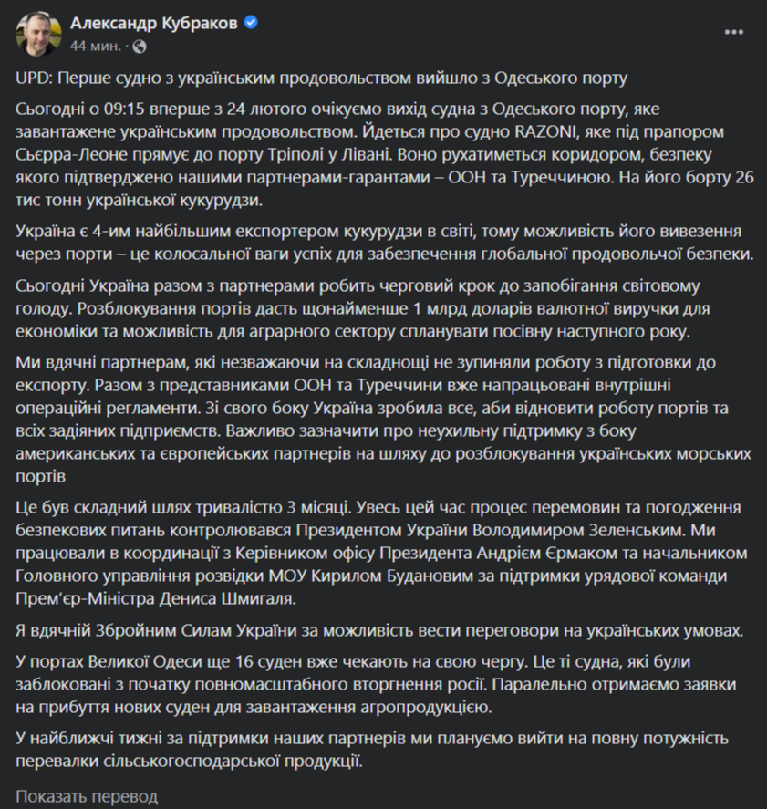 Первое судно с украинским зерном утром в понедельник, 1 августа, покинуло порт Одессы. Корабль Razoni загружен украинской кукурузой. Судно идет в Ливан под флагом Сьерра-Леоне.