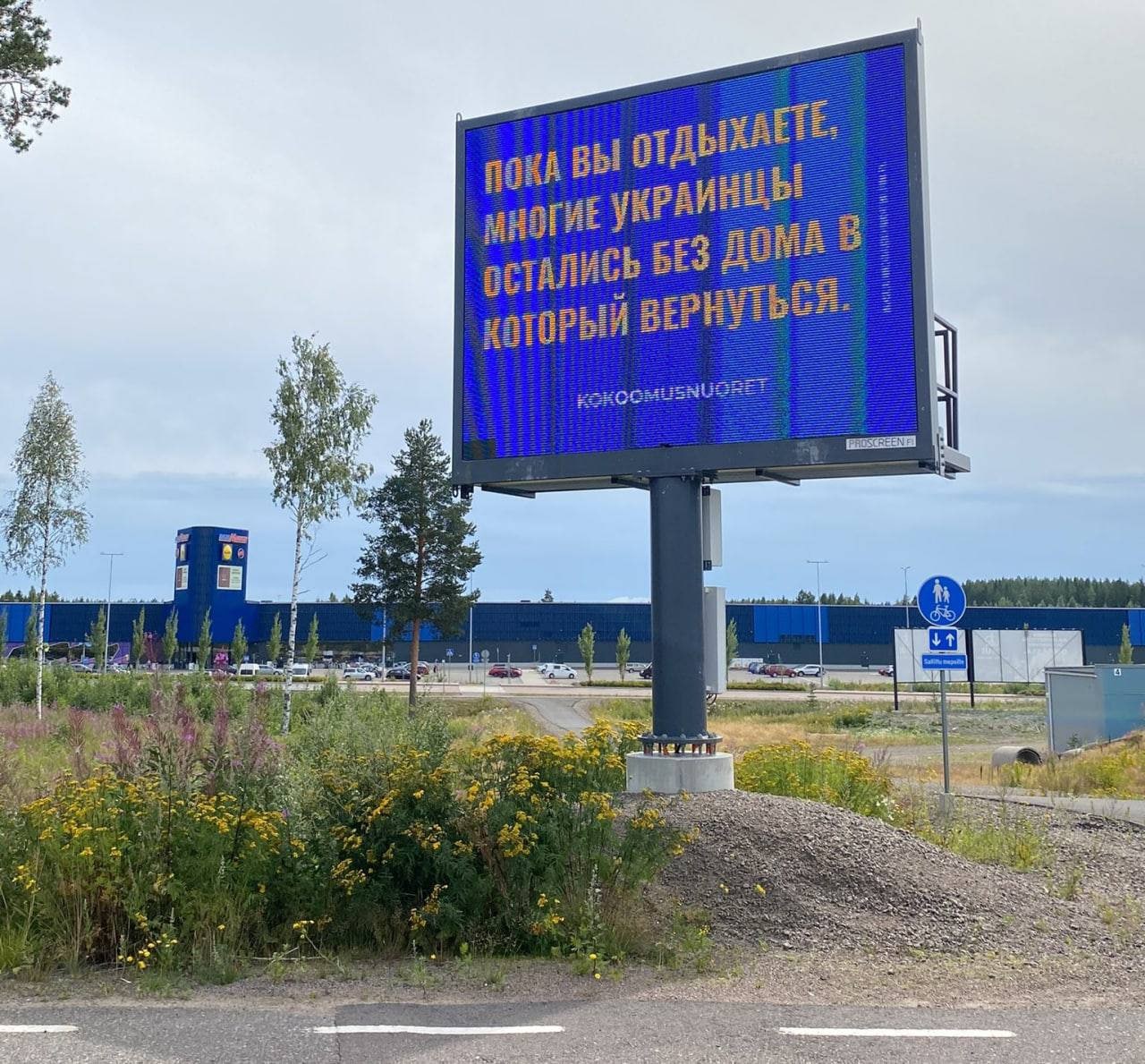 "Пока вы отдыхаете, многие украинцы остались без дома в который вернуться", - гласит надпись на борде, расположенном на пункте пропуска Ваалимаа.