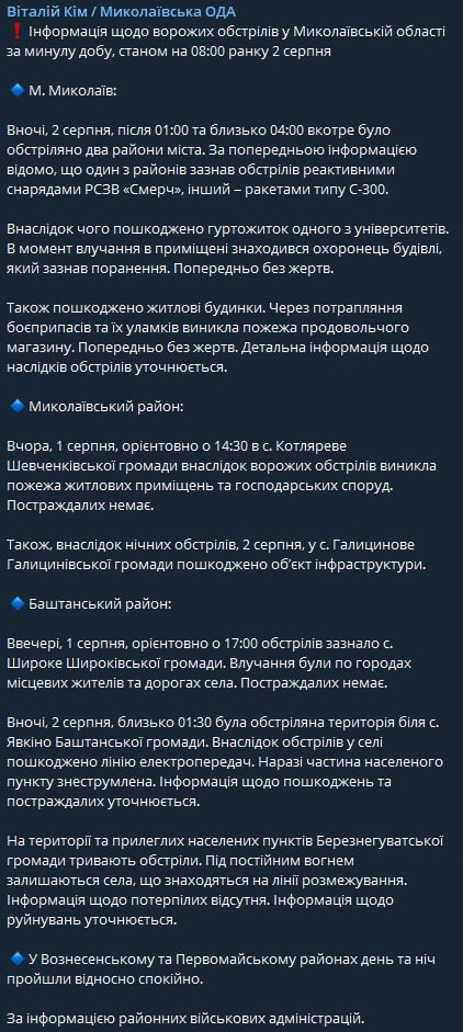 09:19 Николаев ночью обстреливали "Смерчами" и ракетами типа "С-300", сообщил глава Николаевской ОВА Виталий Ким.