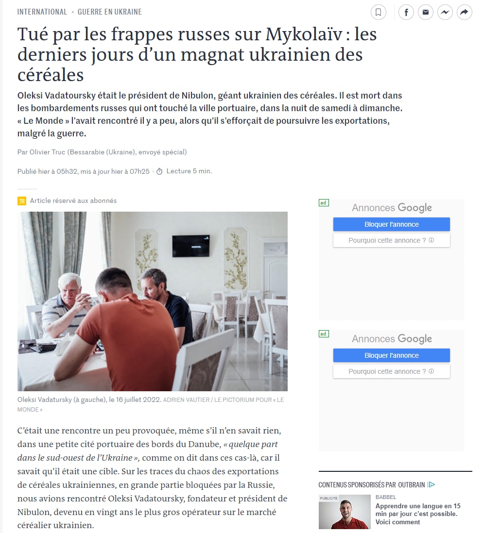 "За день до нашей встречи он едва ушел от ракетного удара по Николаевскому университету. Заметно ошеломленный, он, однако, готовился возвращаться по дороге в Николаев. Он просил нас не вспоминать о его визите. Он знал, что он является приоритетной целью. Алексей Вадатурский знал, что на него нападают тем более, что он осуждал организованную кражу украинского зерна российскими войсками, жертвой которой он стал на своих складах в Херсоне", – рассказал Оливье Трук.