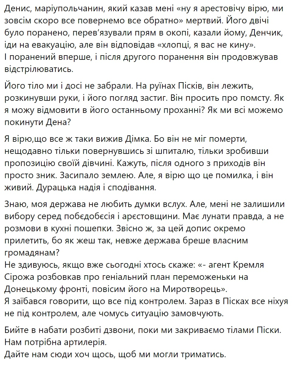 По его словам, россияне бьют крупными калибрами, и многие из его товарищей уже убиты: "Тела тех, кто был мне дороже родни, валяются под жарой в развороченных 152-калибром окопах".