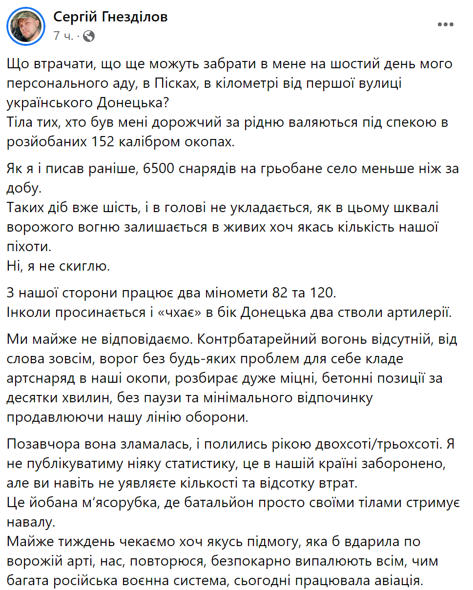 Артиллерийской поддержки бойцы не видят уже неделю. "Прямо сейчас мы теряем Пески, все человеческие и материальные наши возможности почти исчерпаны", - пишет Гнездилов. Он считает, что "ситуацию замалчивают".