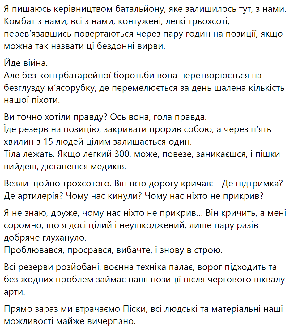 Он пишет, что позавчера - то есть в воскресенье - ВСУ понесли в Песках большие потери убитыми и ранеными. "Едет резерв на позицию, закрывать прорыв собой, а через пять минут из 15 человек целым остается один".