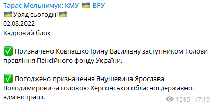 "Одобрено назначение Янушевича Ярослава Владимировича главой Херсонской областной государственной администрации", - написал Мельничук.