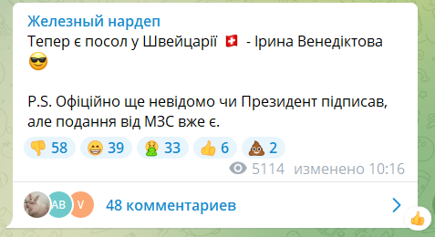 "Теперь есть посол в Швейцарии - Ирина Венедиктова", - написал Железняк.