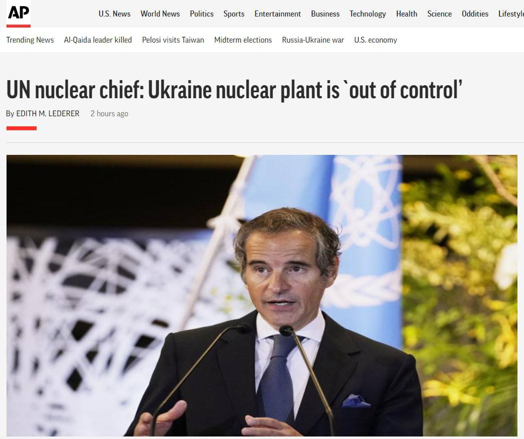 Генеральный директор Международного агентства по атомной энергии (МАГАТЭ) Рафаэль Гросси заявил, что крупнейшая в Европе Запорожская атомная электростанция "полностью вышла из-под контроля", и обратился к Украине и России с призывом как можно быстрее разрешить экспертам посетить АЭС, чтобы стабилизировать ситуацию и избежать ядерной аварии.