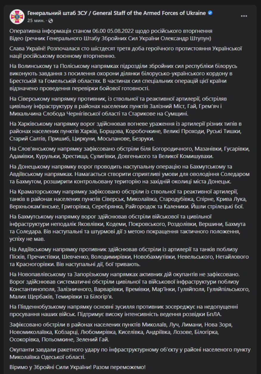 07:50 Ключевое из сводки Генштаба ВСУ на утро 5 августа.