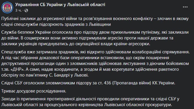 12:52 В СБУ сообщают о задержании мужчины, который призывал ударить ракетами по памятнику Бандере во Львове и передал "ДНР" координаты этого памятника.