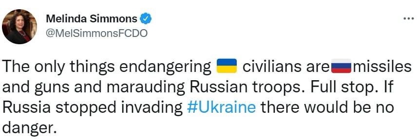 13:36 "Единственное, что несет угрозу мирному населению Украины - российские ракеты, пушки, мародерство российских войск", - заявила посол Британии в Украине Мелинда Симмонс.