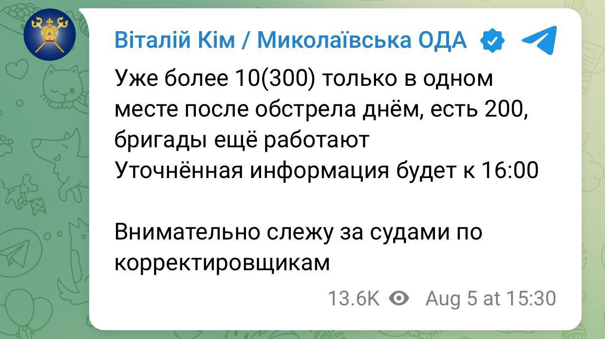 09:00 Ночью и утром под обстрел попал Корабельный район Николаева. Предварительно известно о попадании в частный дом и повреждении домов вокруг.