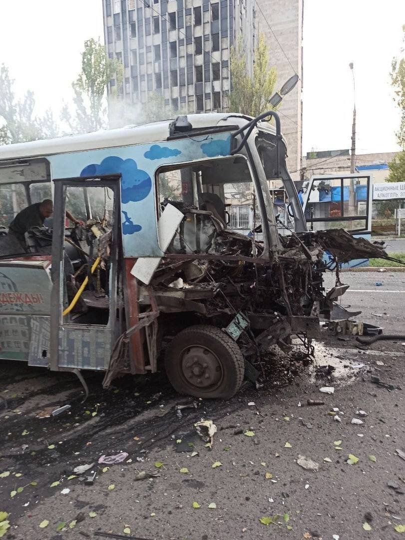 20:40 Последствия попадания снаряда в автобус №19 в районе "Точмаша" в Киевском районе Донецка.