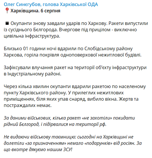 Об этом сообщает глава Харьковской ОВА Олег Синегубов.