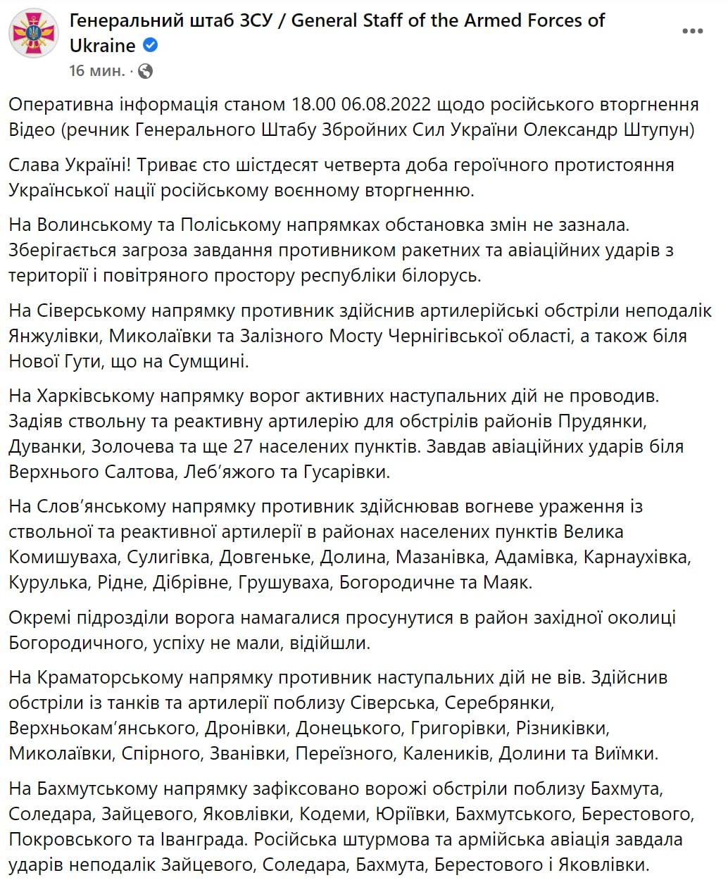 В субботу вечером, 7 августа, Генеральный штаб Вооруженных сил Украины в Facebook опубликовал новую сводку о военной ситуации.