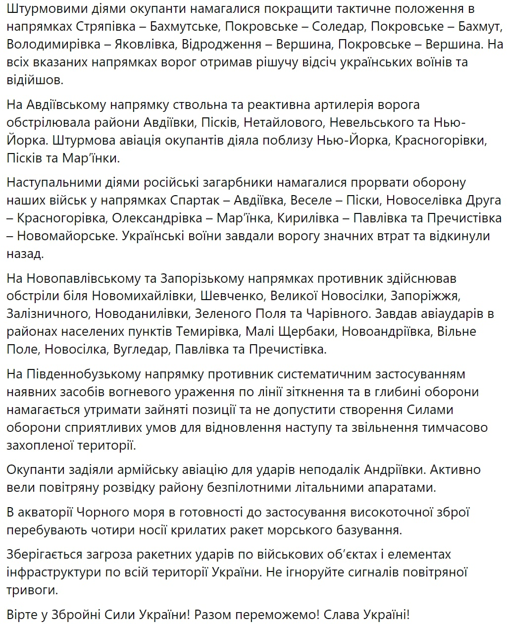 - на Авдеевском направлении враг пытался прорваться в направлениях Спартак – Авдеевка, Веселое – Пески, Новоселовка Вторая – Красногоровка, Александровка – Марьинка, Кирилловка – Павловка и Пречистовка – Новомайорское. Получил значительные потери и был отброшен.