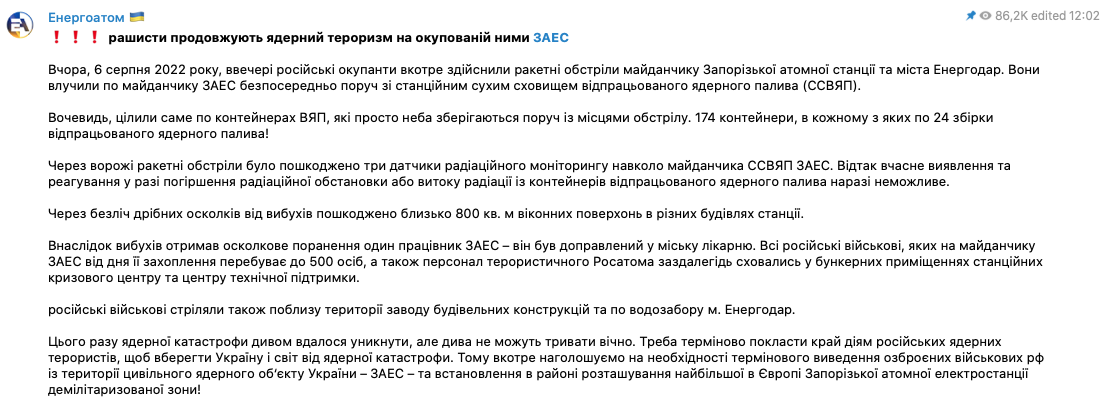 "Очевидно, целились именно по контейнерам отработанного ядерного топлива, которые под открытым небом хранятся рядом с местами обстрела. 174 контейнера, в каждом из которых по 24 сборки отработавшего ядерного топлива", - говорится в сообщении.