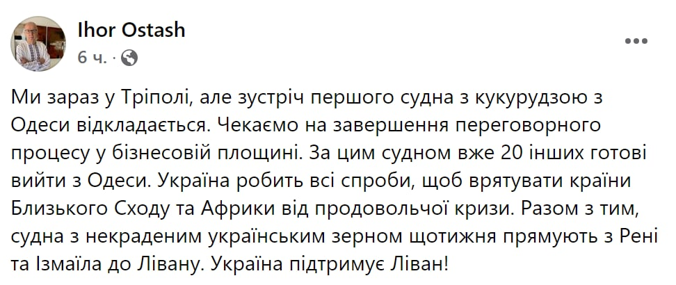 "Мы сейчас в Триполи, но встреча первого судна с кукурузой из Одессы откладывается. Ждем завершения переговорного процесса в бизнес-плоскости", - написал Осташ. Тем не менее, по его словам, еще 20 судов готовы выйти из Одессы.