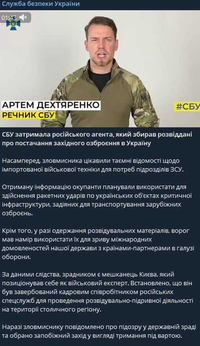 СБУ заявила о задержании в Киеве "военного эксперта", который собирал данные об импорте военной техники для ВСУ и передавал их россиянам. Информацию он получал от знакомых в оборонной сфере якобы для написания публикаций.