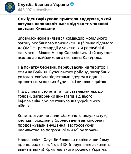 СБУ заявляет, что приятель главы Чечни Рамзана Кадырова пытал жителей Киевской области во время оккупации, в том числе и несовершеннолетних детей.