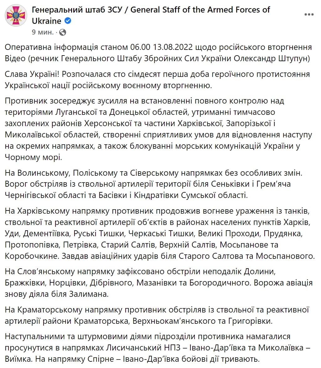 В субботу, 13 августа, в Украине идет уже 171-й день войны с Россией.