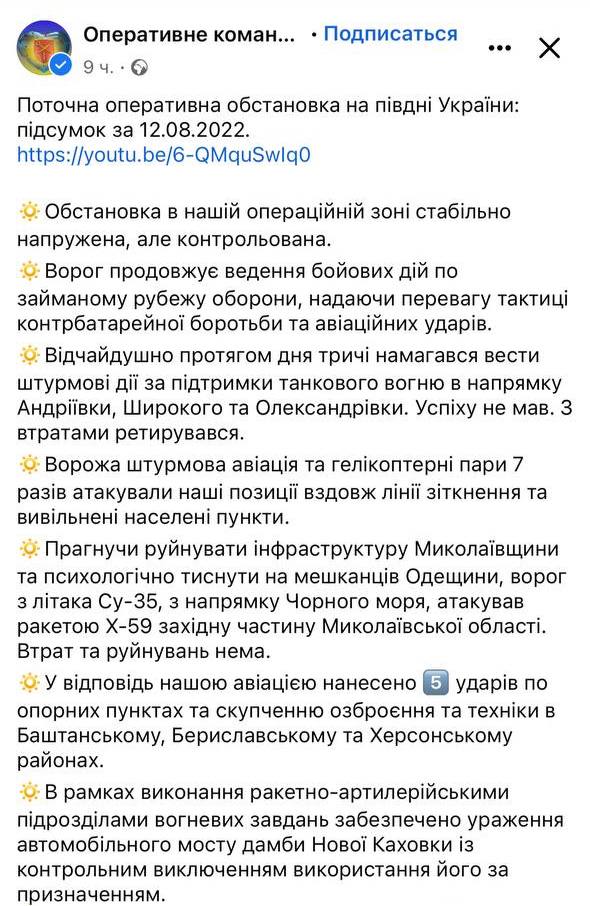 11:10 Оперативное командование "Юг" сообщает, что ВСУ нанесли удар по автомобильному мосту на дамбе в Новой Каховке.
