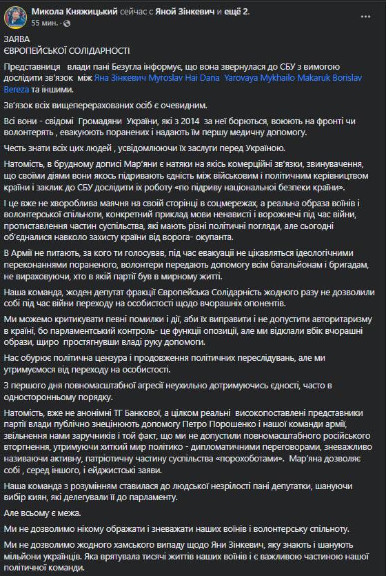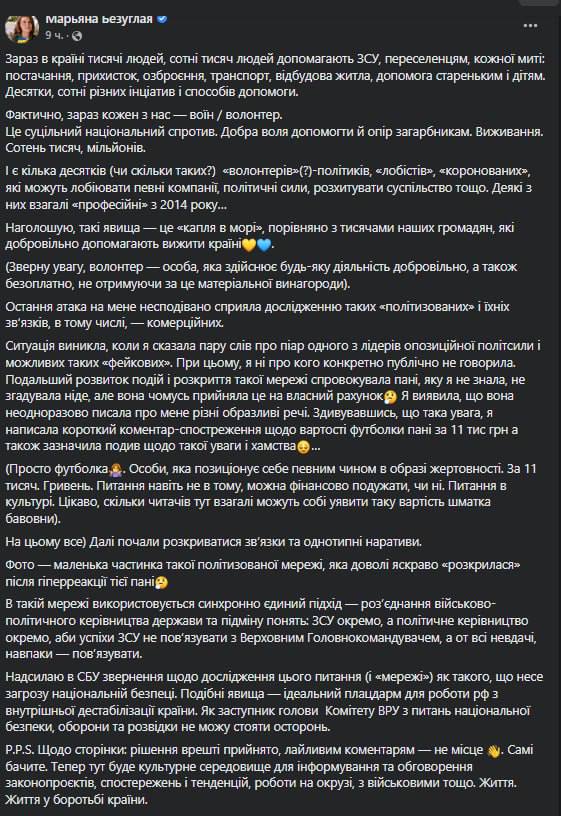 Депутат от "Слуги народа" Марьяна Безуглая отправила запрос в СБУ с требованием провести расследование по факту существования некой сети волонтёров и политиков (преимущественно из лагеря Петра Порошенко), которые, по мнению Безуглой, во время войны согласовано расшатывают ситуацию в Украине, проводя линию на раскол между политическим руководством страны и военным командованием.