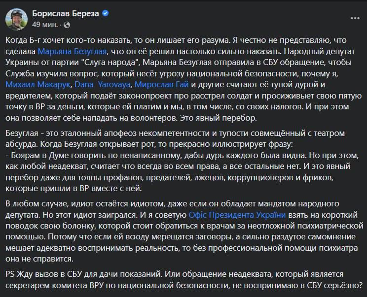 Экс-нардеп Борислав Береза, который, по мнению Безуглой, также является частью "сети" также отреагировал: "Я советую Офису Президента Украины взять на короткий поводок свою болонку, которой стоит обратиться к врачам за неотложной психиатрической помощью. Потому что если ей всюду мерещатся заговоры, а сильно раздутое самомнение мешает адекватно воспринимать реальность, то без профессиональной помощи психиатра она не справится".
