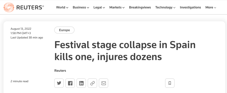 В Испании во время фестиваля мощный ветер обвалил сцену. Есть погибший и раненые. Видео
