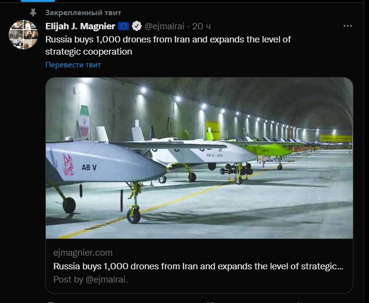 "Россия подписала контракт с Ираном на покупку 1000 беспилотников после того, как Иран поставил несколько самолетов и тренажер, на котором тренировались российские офицеры. Первые дроны уже применялись в Украине", - пишет Мегье.