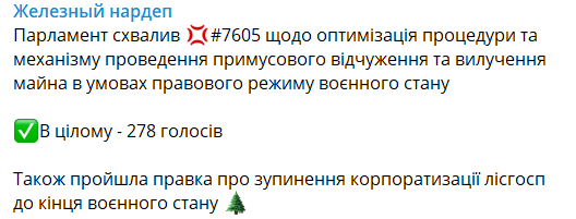 Также, как пишет Железняк, прошла правка об остановке корпоратизации лесхозов до конца военного положения.