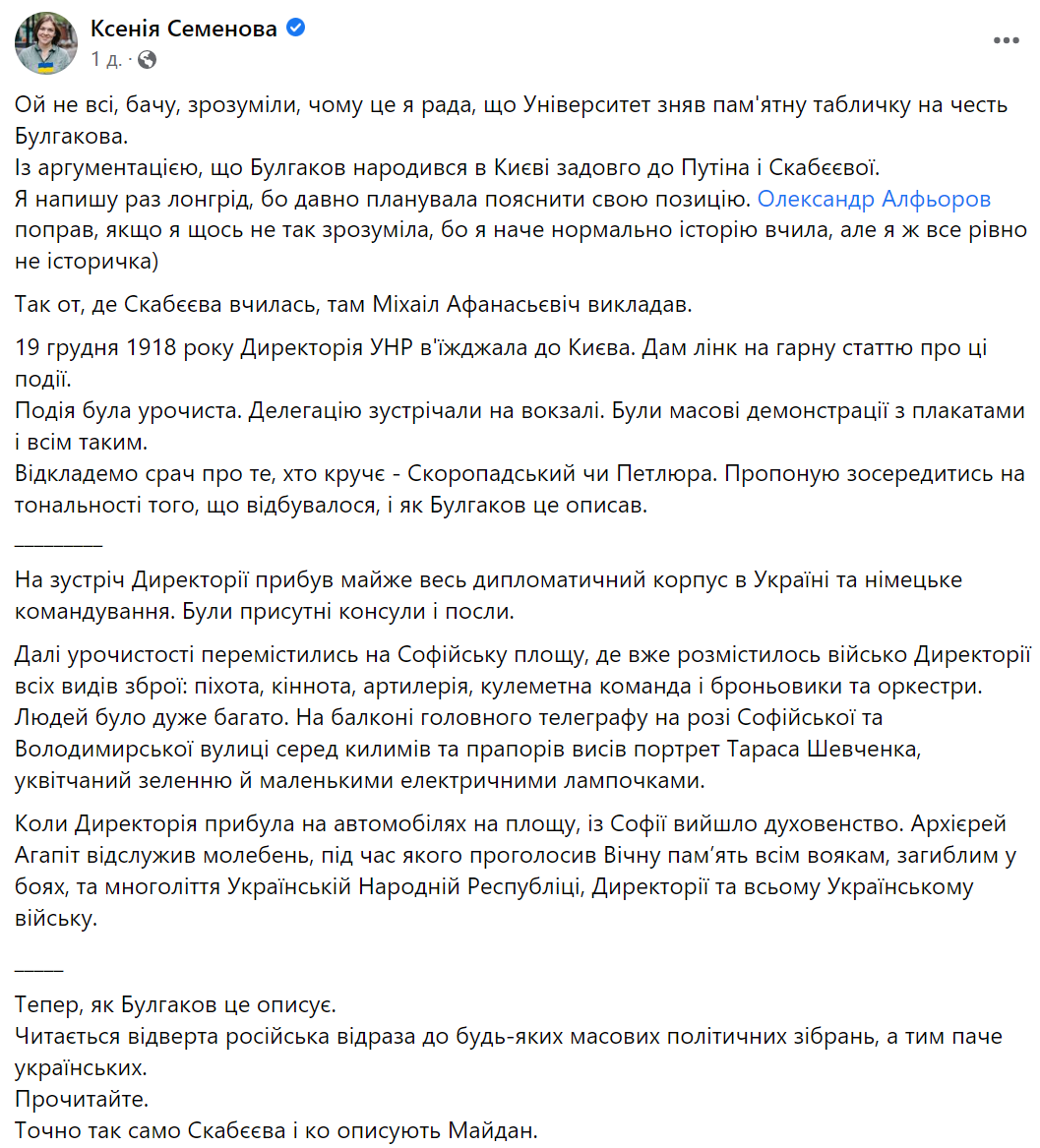 Бурная дискуссия развернулась в комментариях к посту депутата Киевсовета Ксении Семеновой, которая ранее призывала снести памятник Булгакову на Андреевском спуске. А теперь поддержала демонтаж доски со здания КНУ.